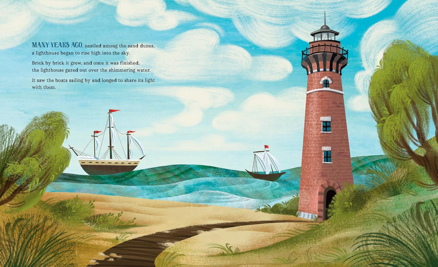 Brick by brick, a lighthouse begins to rise high into the sky beside a shimmering lake. Nestled among the sand dunes near Mears, Michigan, the new lighthouse stands 115 feet tall. The lighthouse is eager to share its light with the ships sailing on Lake Michigan. But first it needs a keeper to light its oil lamp, to ignite its spark. Soon a keeper comes along. The lighthouse and its keeper settle into a daily routine. The keeper sweeps away the sand that sifts in. He cleans the windows. And every night, the keeper climbs to the top of the lighthouse to light the oil lamp, sharing its light with the ships sailing on the lake. When the keeper can’t continue his duties, a new keeper arrives. And then another and another as the years go by.